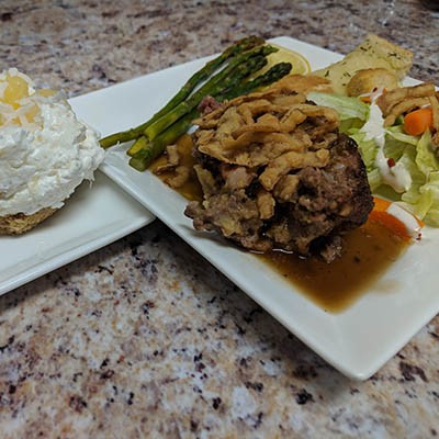 - Serve hot with smashed potatoes, gravy and onion strings.