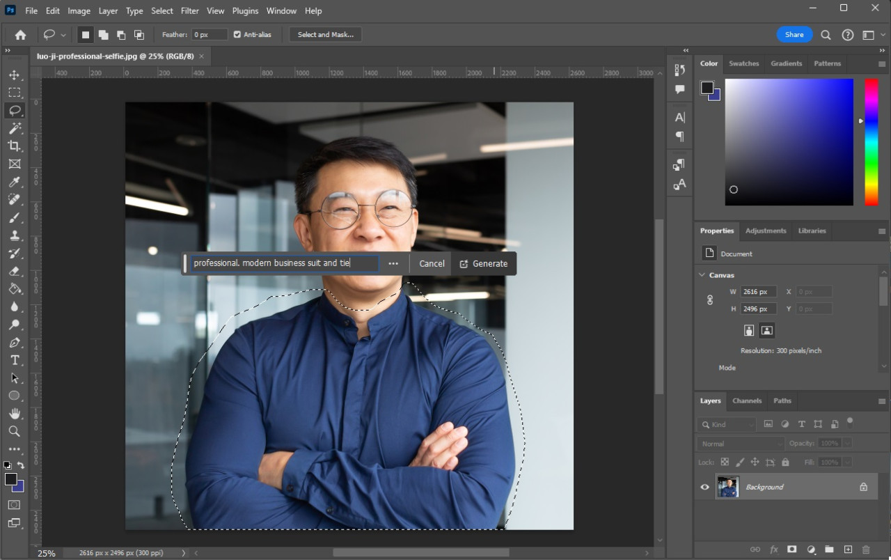 Now, for our prompt, we’re going to tell Photoshop that we want a “professional, modern business suit and tie.”