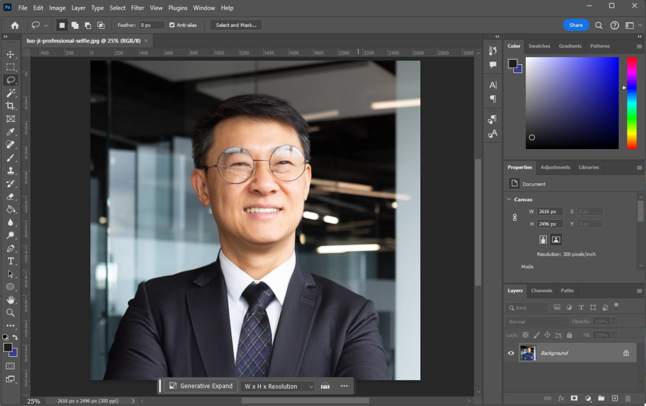 Let’s say you took staff photos, but one particular board member was a little more casual than everyone else, and you want the photos to match on your website. As long as you are working with a nice, high quality image, Adobe’s Generative AI feature can let you do some pretty amazing things.
